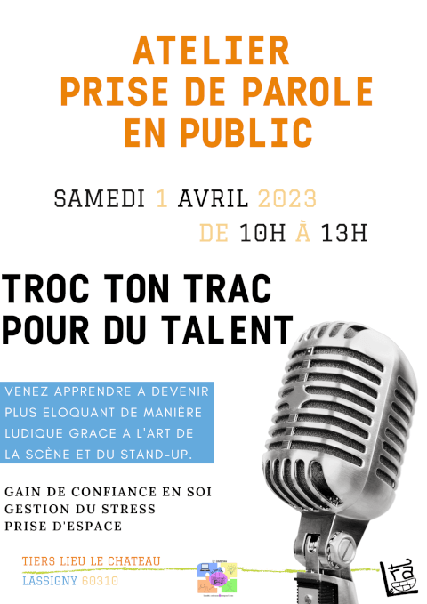 Venez assister à un atelier collectif pour améliorer votre prise de parole en public. Réservations auprès du Tiers Lieu Le Château : 🔗 tllechateau.com 📞 06 21 15 01 78 📧 tierslieu.lechateau1@gmail.com